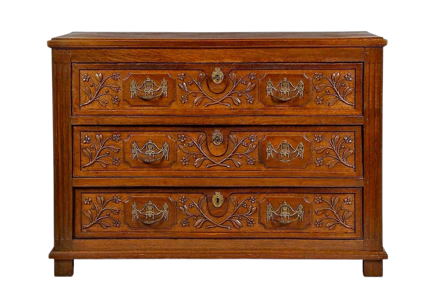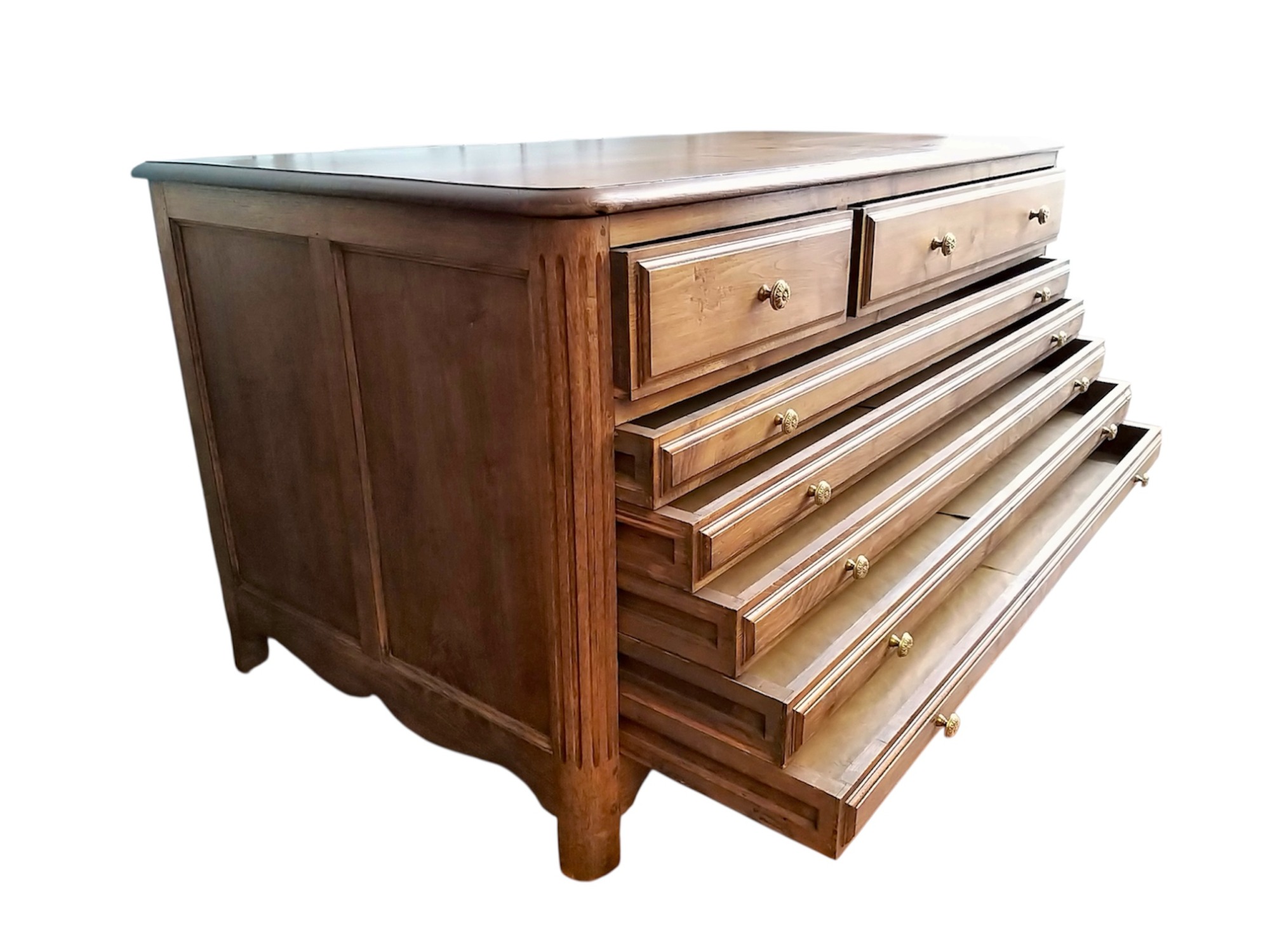 Commode bordelaise Louis XV en noyer. Façade galbée à trois tiroirs sur trois rangs, moulurés. Plateau, côtés et tiroirs marquetés.
