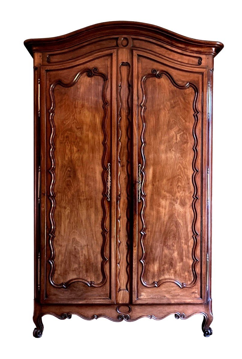 Armoire d’Île-de-France en noyer sculpté, ferrures en fer forgé, Estampillée I. Martiny (ébéniste non répertorié). Début du XVIIIᵉ siècle.