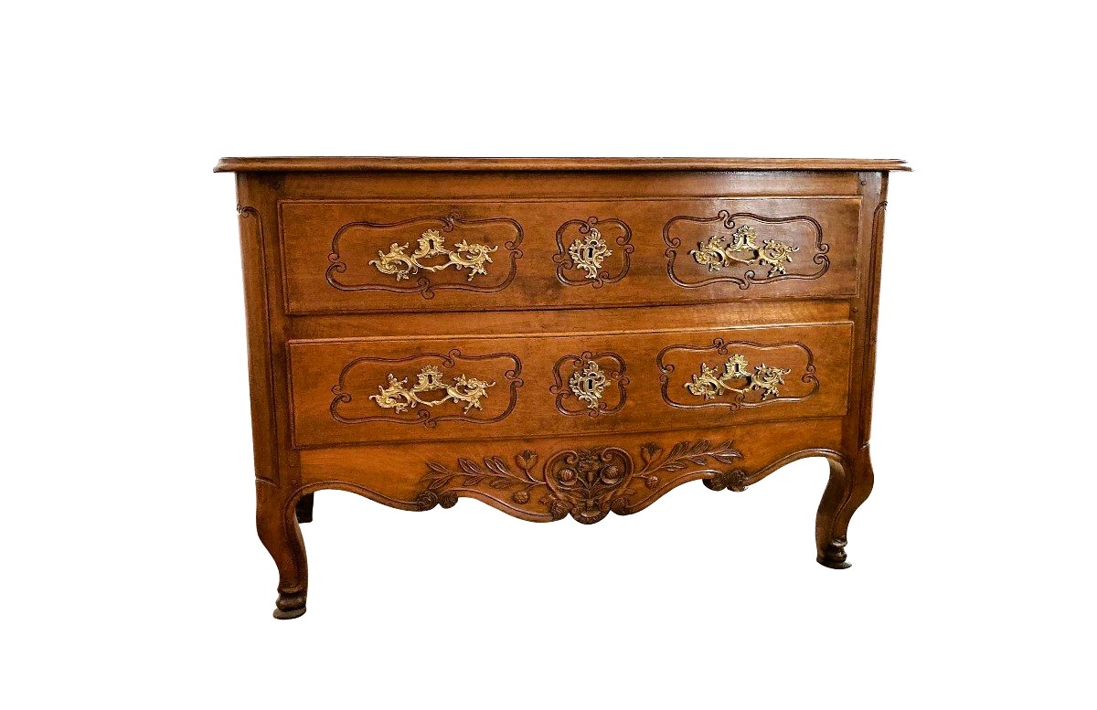 Commode sauteuse provençale en noyer. Façade galbée à deux tiroirs à décors sculptés de volutes. Plateau mouvementé à bec de corbin.
